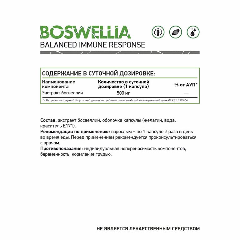 - Состав: Экстракт босвеллии, оболочка капсулы (желатин, вода, краситель Е171*).