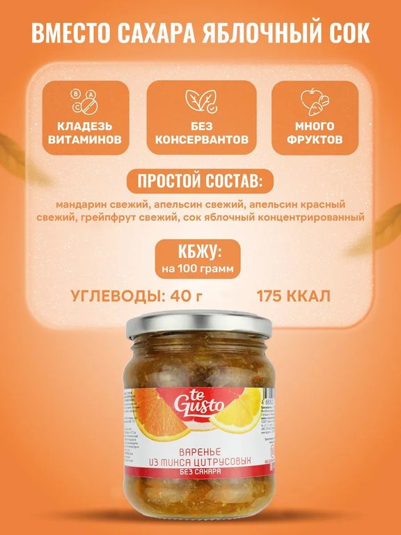 - Состав: сок яблочный концентрированный, мандарин свежий, апельсин свежий, апельсин красный свежий, лимон свежий, грейпфрукт свежий.