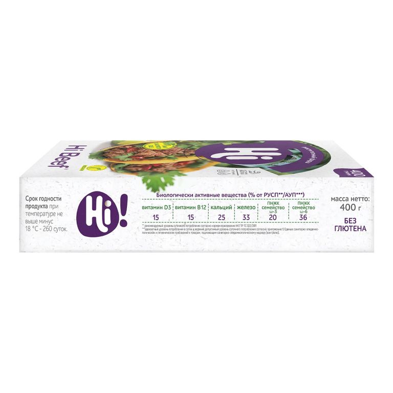 - Состав: вода, текстурированный растительный белок (подсолнечный, соевый, гороховый), рафинированные дезодорированные растительные масла (рапсовое, кокосовое, подсолнечное), глюконат кальция, пищевые волокна,ароматизатор натуральный говядина, соль пищевая, глюкоза, концентрат пищевой сухой натуральный свекольный, чеснок молотый, краситель сахарный колер I, перец черный молотый, антиокислитель - лимонная кислота, биглицинат железа, витамин D3, витамин B12.