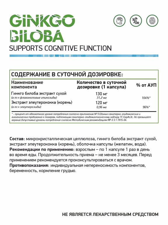 - Состав: микрокристаллическая целлюлоза, гинкго билоба экстракт сухой, экстракт элеутерококка (корень), оболочка капсулы (желатин, вода).