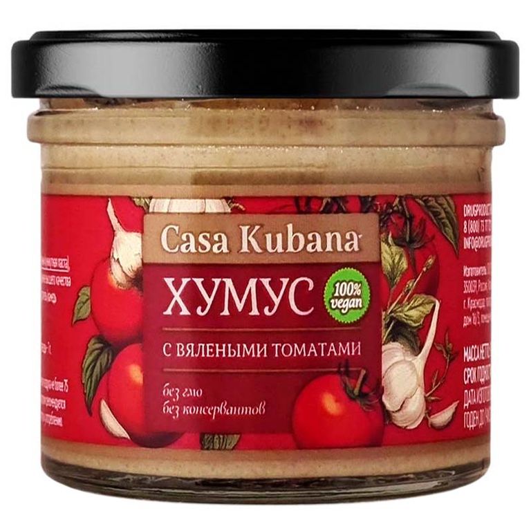 - Состав: Нут, вода питьевая, масло подсолнечное рафинированное дезодорированное, тахини (кунжутная паста), томат вяленный восстановленный (томат сушеный, вода), масло оливковое нерафинированное высшего качества, дрожжевой экстракт, соль морская, чеснок сушеный, загуститель: камедь гуаровая, перец красный острый сушеный, тимьян.