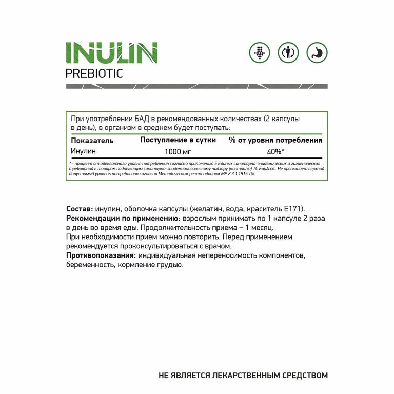 - Состав: Инулин, оболочка капсулы (желатин, вода, краситель Е171*).