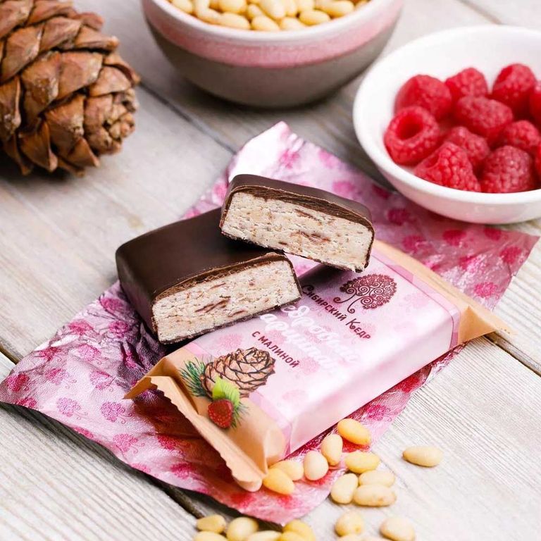 - Состав: ядро кедрового ореха, сахар, шоколадная глазурь (сахар, какао-масло, какао-порошок, лецитин подсолнечный (эмульгатор)), молоко сухое цельное, молоко сухое обезжиренное, ядро миндаля, ядро кешью, патока, пастила малиновая (пюре яблочное, ягоды малины), сорбитовый сироп (подсластитель), лецитин подсолнечный (эмульгатор), экстракт ванили натуральный. Содержит подсластитель, при чрезмерном употреблении может оказывать слабительное действие. Возможно наличие следов арахиса, кунжута, злаков, яичных продуктов и других видов орехов.