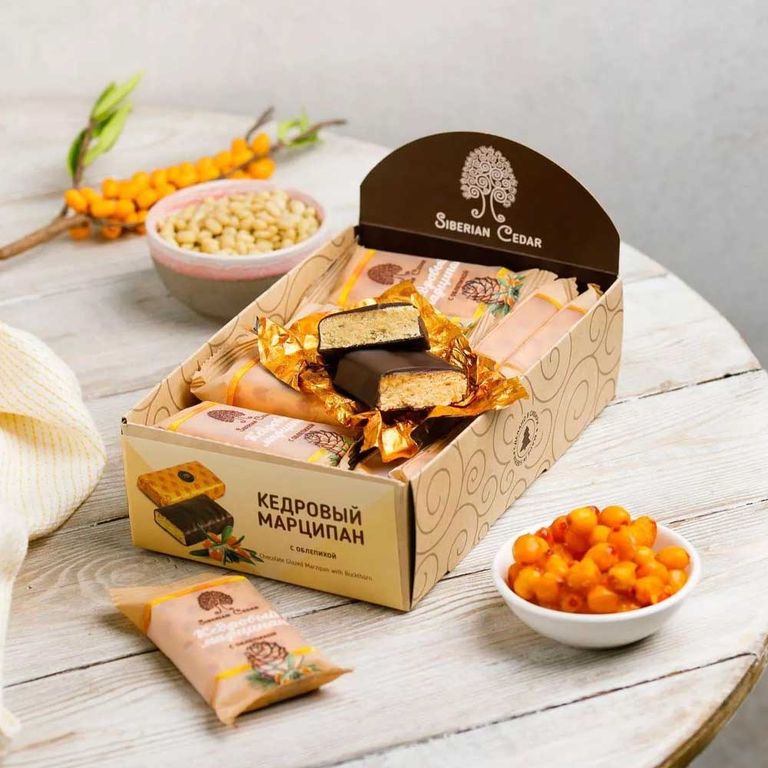 - Состав: ядро кедрового ореха, сахар, шоколадная глазурь (сахар, какао-масло, какао-порошок, эмульгатор лецитин подсолнечный), молоко сухое цельное, молоко сухое обезжиренное, ядро миндаля, ядро кешью, патока, пастила облепиховая (пюре яблочное, ягоды облепихи), лецитин подсолнечный (эмульгатор), сорбитовый сироп (подсластитель), экстракт ванили натуральный, аскорбиновая кислота (антиокислитель). Содержит подсластитель, при чрезмерном употреблении может оказывать слабительное действие. Возможно наличие следов арахиса, кунжута, злаков, яичных продуктов и других видов орехов.