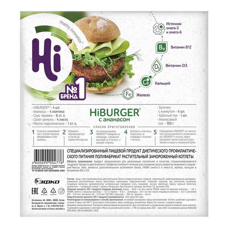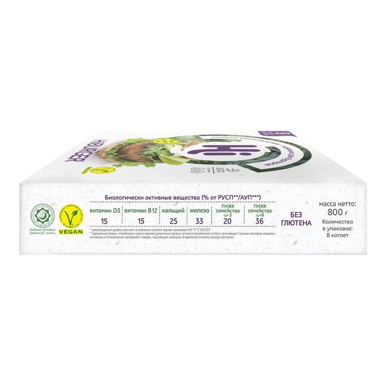 - Состав: вода, текстурированный растительный белок (подсолнечный, соевый, гороховый), рафинированные дезодорированные растительные масла (рапсовое, кокосовое, подсолнечное), глюконат кальция, лук репчатый сушеный, пищевые волокна, ароматизатор натуральный говядина, соль пищевая, чеснок молотый, краситель — сахарный колер I, зелень петрушки, бисглицинат железа, витамин D3, витамин В12.