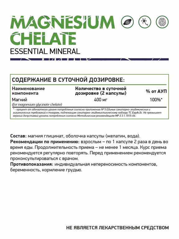 - Состав: Магния глицинат, оболочка капсулы (желатин, вода).