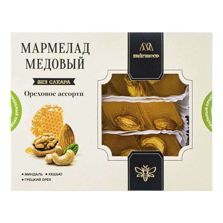 - Состав: патока, фруктоза, гречишный мёд, пектин, грецкий орех, миндаль, кешью.