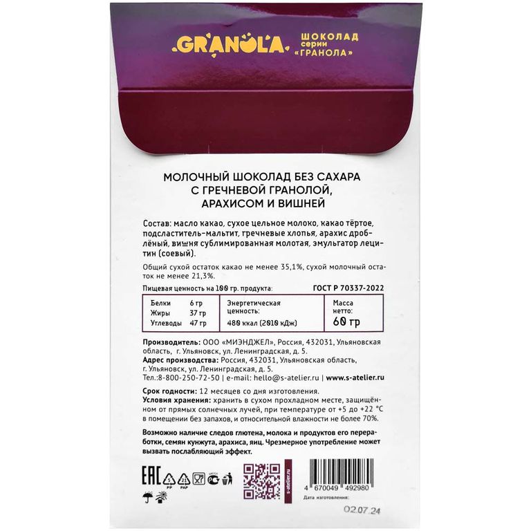 - Состав: масло какао, сухое цельное молоко, какао тёртое, подсластитель мальтит, гречневые хлопья, арахис дробленный, вишня сублимированная молотая, эмульгатор соевый летицин.