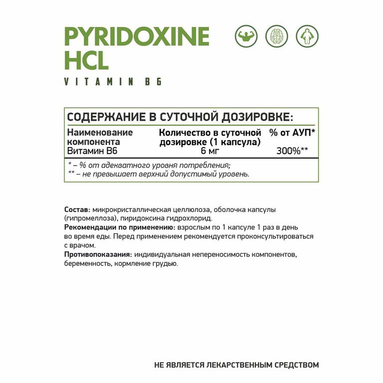 - Состав: микрокристаллическая целлюлоза, оболочка капсулы (гипромеллоза), пиридоксина гидрохлорид.