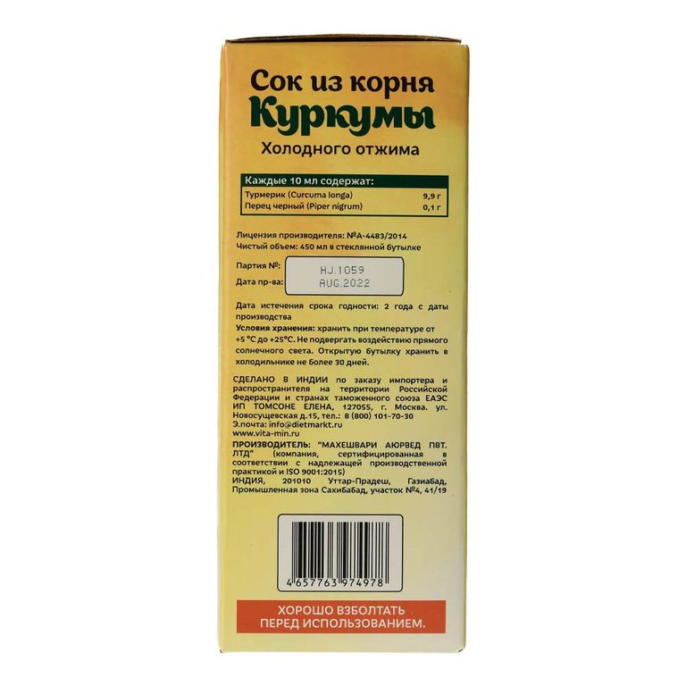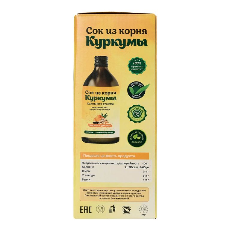 Сок куркумы также можно употреблять постоянно. - Срок годности: 2 года.