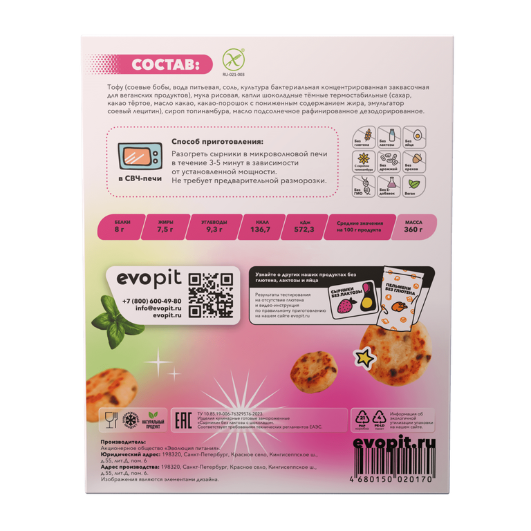 - Состав: тесто: Тофу (соевые бобы, вода питьевая, соль, культура бактериальная концентрированная заквасочная для веганских продуктов), мука рисовая, капли шоколадные тёмные термостабильные (сахар, какао тёртое, масло какао, какао-порошок с пониженным содержанием жира, эмульгатор соевый лецитин), сироп топинамбура, масло подсолнечное рафинированное дезодорированное.