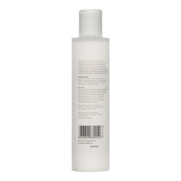- Состав: Aqua (вода), Lavandula Angustifolia Flower Water (гидролат лаванды), Decyl Glucoside (децил глюкозид), Glycerin (глицерин), D-Panthenol (Д-пантенол), Aloe Barbadensis (Aloe Vera) Leaf Gel (гель алоэ вера), Glycolic Acid (гликолевая кислота), Malic Acid (яблочная кислота), Tartaric Acid (винная кислота), Citric Acid (лимонная кислота), Maltodextrin (мальтодекстрин), Inulin (инулин), Allantoin (аллантоин), Benzyl Alcohol (бензиловый спирт), Potassium Sorbate (сорбат калия), Sodium Benzoate (бензоат натрия), Lavandula angustifolia (lavender) flower extract (экстракт лаванды), Lavandula angustifolia (lavender) essential oil (эфирное масло лаванды).